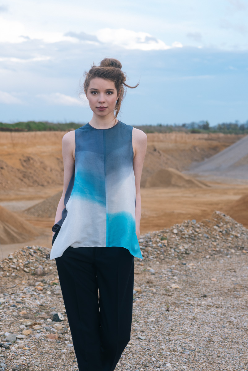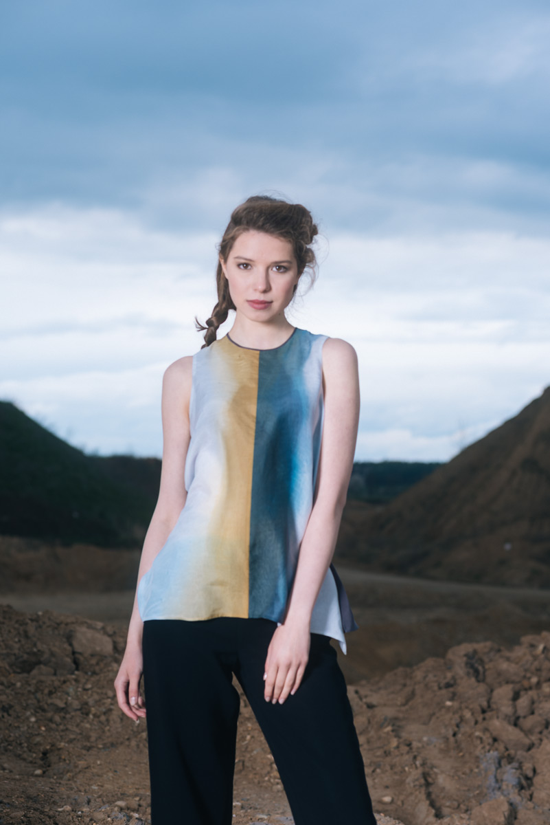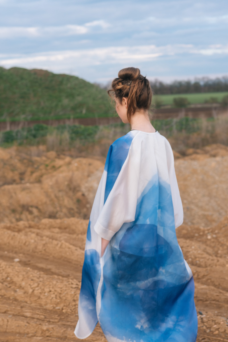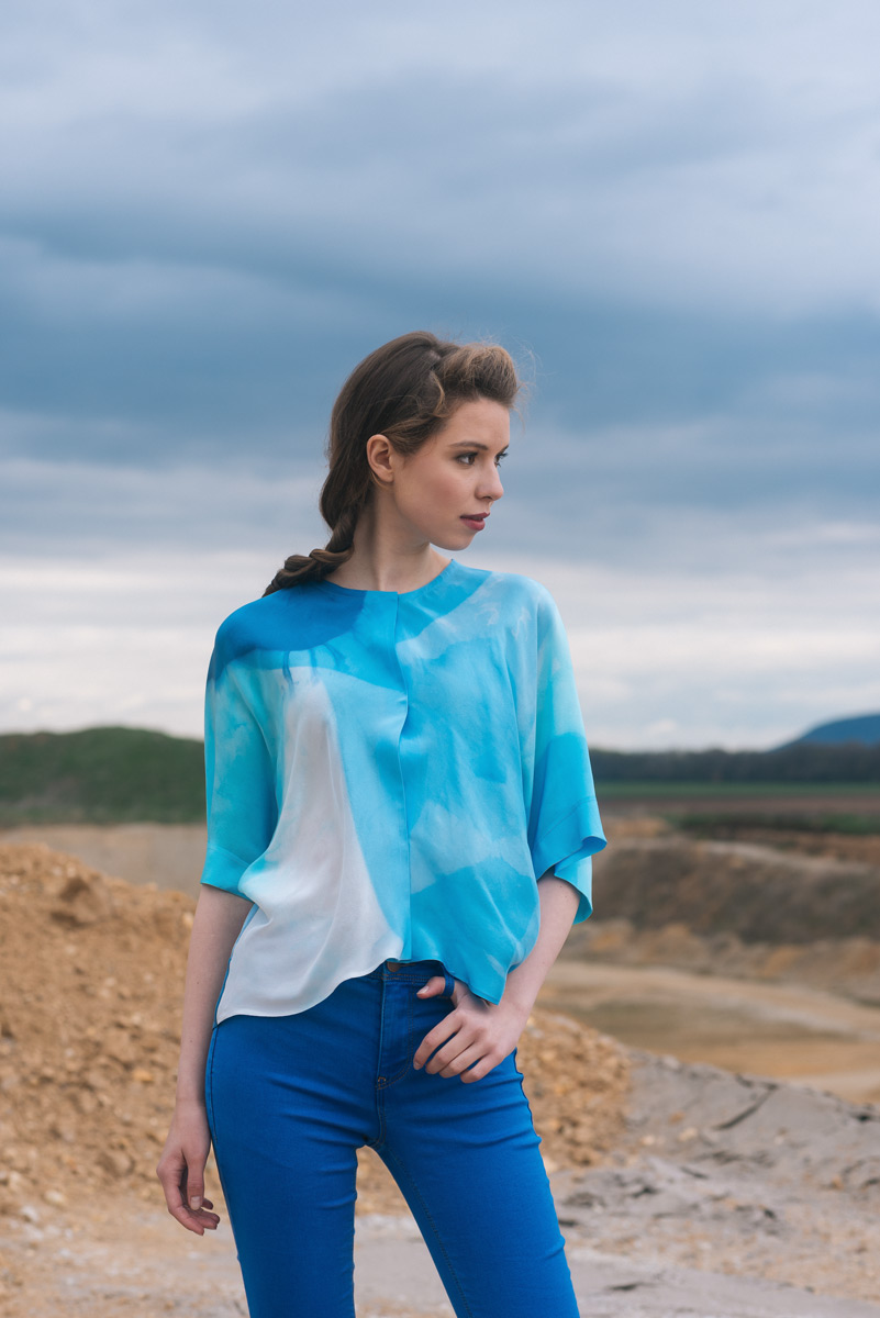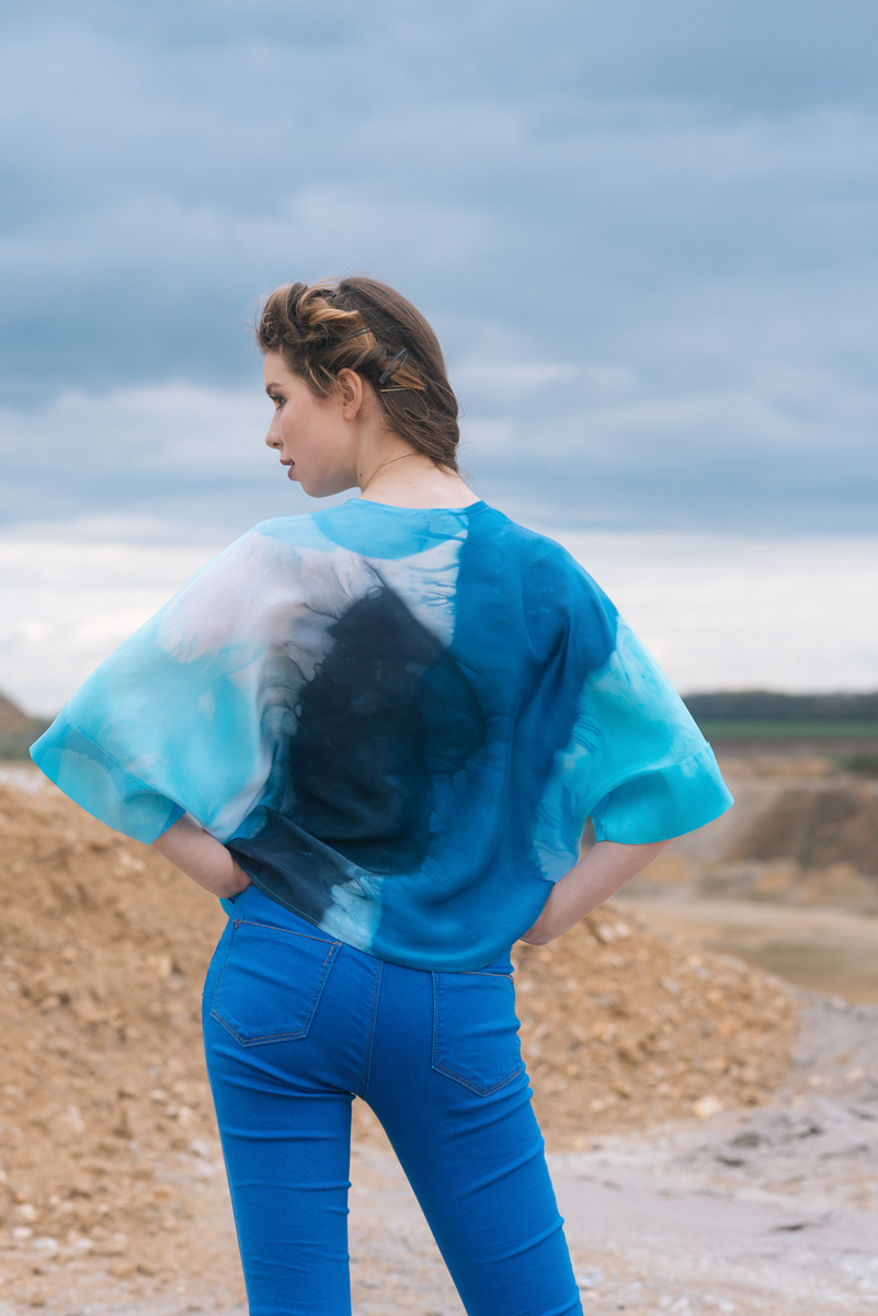 Modré z nebe je kolekce hedvábných a bavlněných halenek a šatů. Déšť na ně dopadne v podobě ručně barvených akvarelových skvrn. Rozlité obrazy vznikají