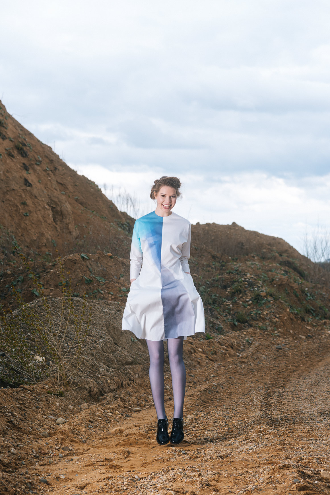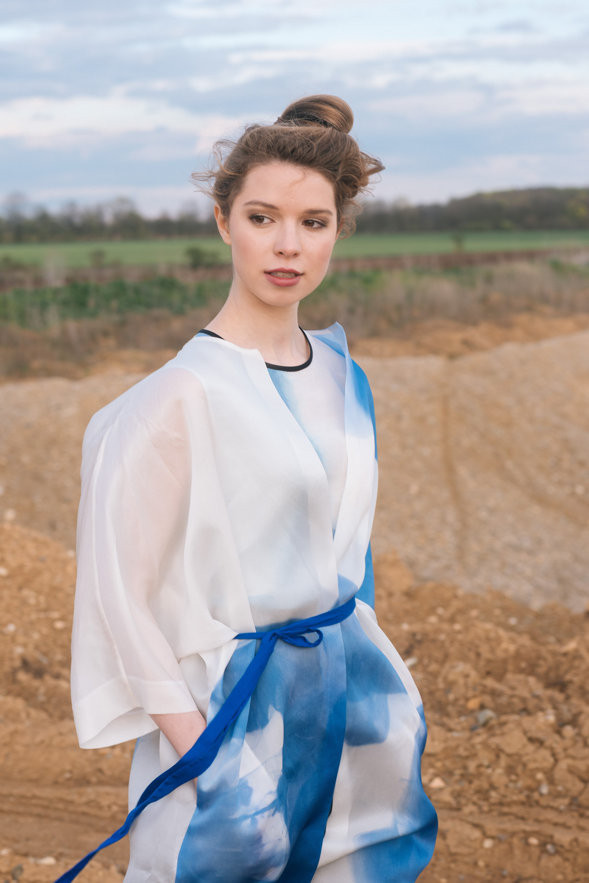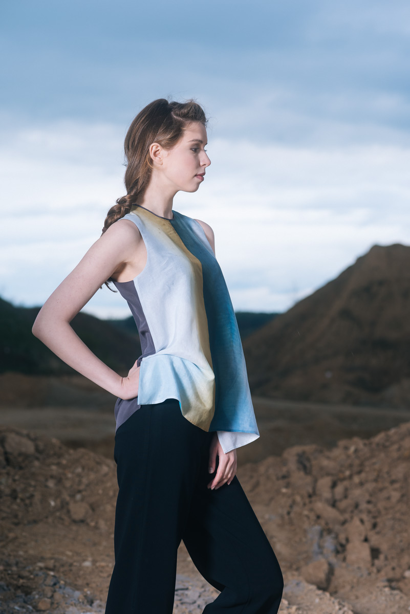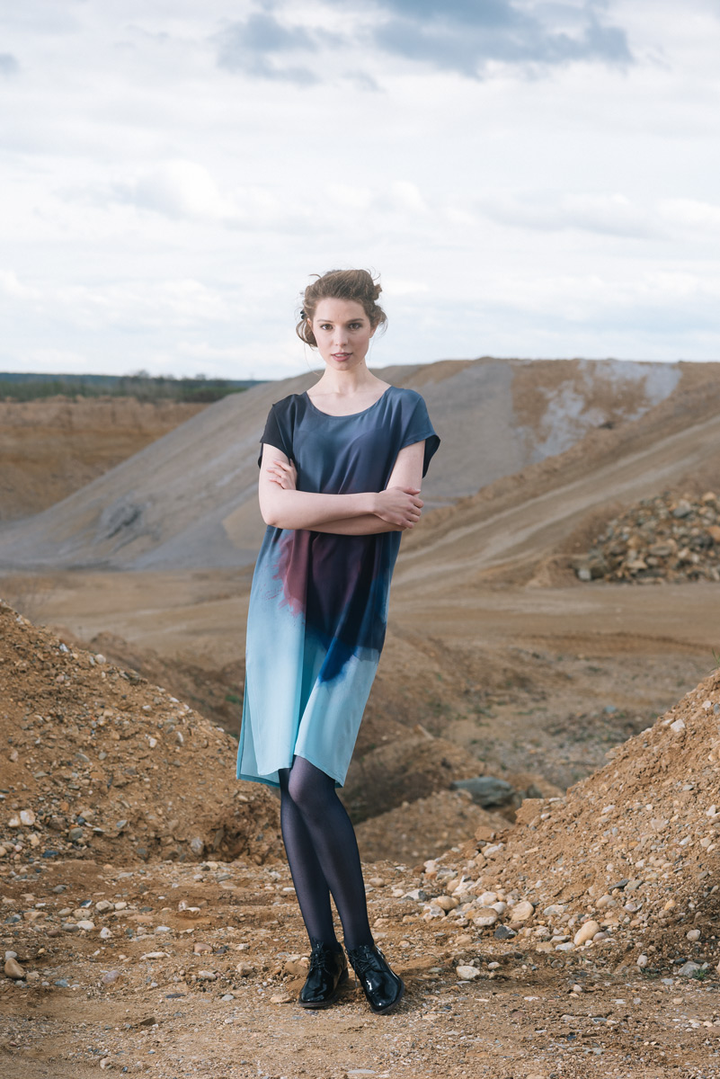 Modré z nebe je kolekce hedvábných a bavlněných halenek a šatů. Déšť na ně dopadne v podobě ručně barvených akvarelových skvrn. Rozlité obrazy vznikají